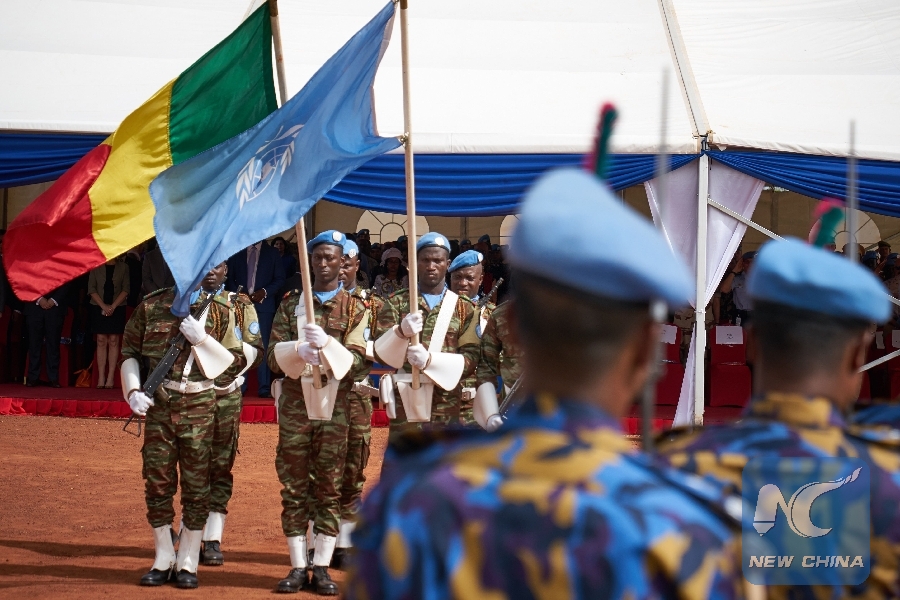 File Photo: Soldiers hold the UN and Malian flags during the ceremony of Peacekeepers' Day at the operating base of MINUSMA (The United Nations Multidimensional Integrated Stabilization Mission in Mali) in Bamako on May 29, 2018. (Xinhua/AFP)