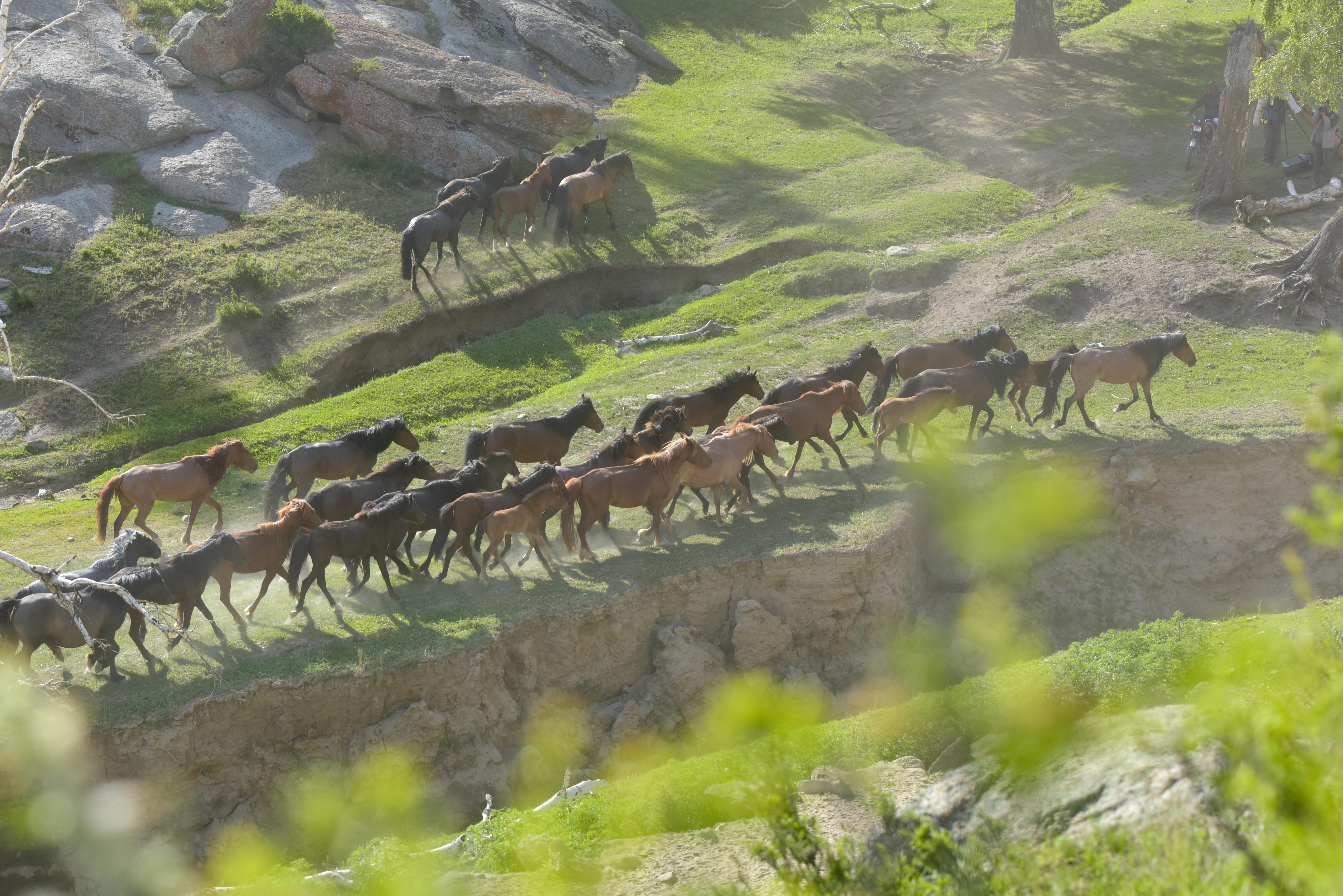 Photo taken on June 6, 2019 shows horses running in a trip for summer pasture in northwest China's Xinjiang Uygur Autonomous Region. (Xinhua/Ding Lei)
