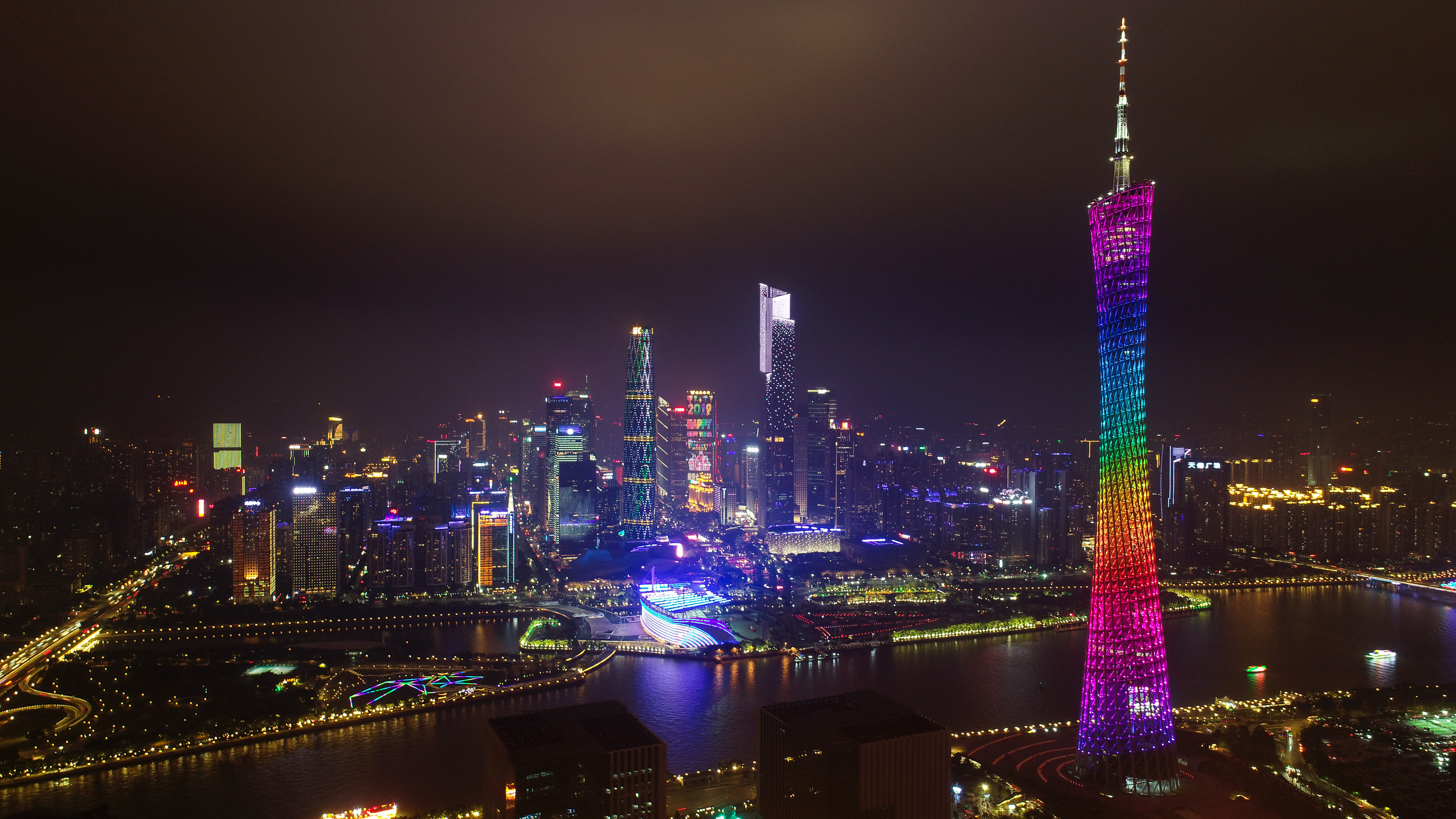 Aerial photo taken on Feb. 12, 2019 shows the night view of the Huacheng Square and Canton Tower in Guangzhou, capital of south China's Guangdong Province. (Xinhua)