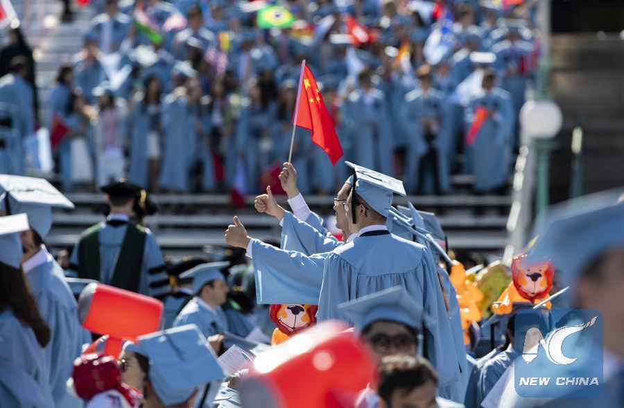 Graduate students from China pose for photos before the Columbia University Commencement ceremony in New York, the United States, May 22, 2019. (Xinhua/Wang Ying)
