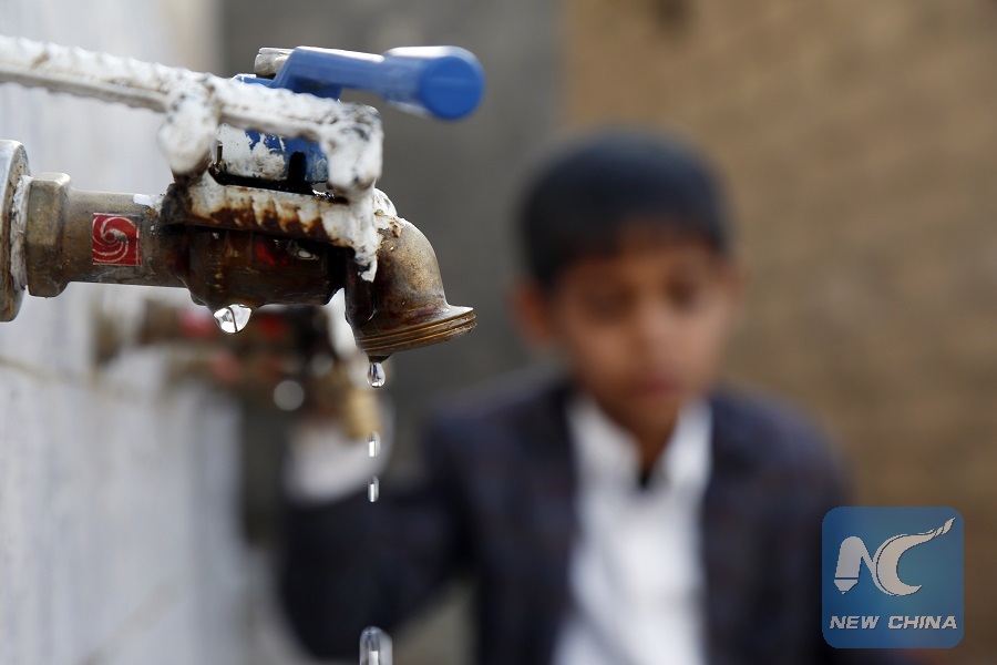 A boy is seen near a tap in Sanaa, Yemen, on March 22, 2019, which is the World Water Day. Yemen has suffered from grinding crisis of water after four years of deadly civil war. According to the UN, over 18 million Yemenis currently lack access to clean drinking water. (Xinhua/Mohammed Mohammed)