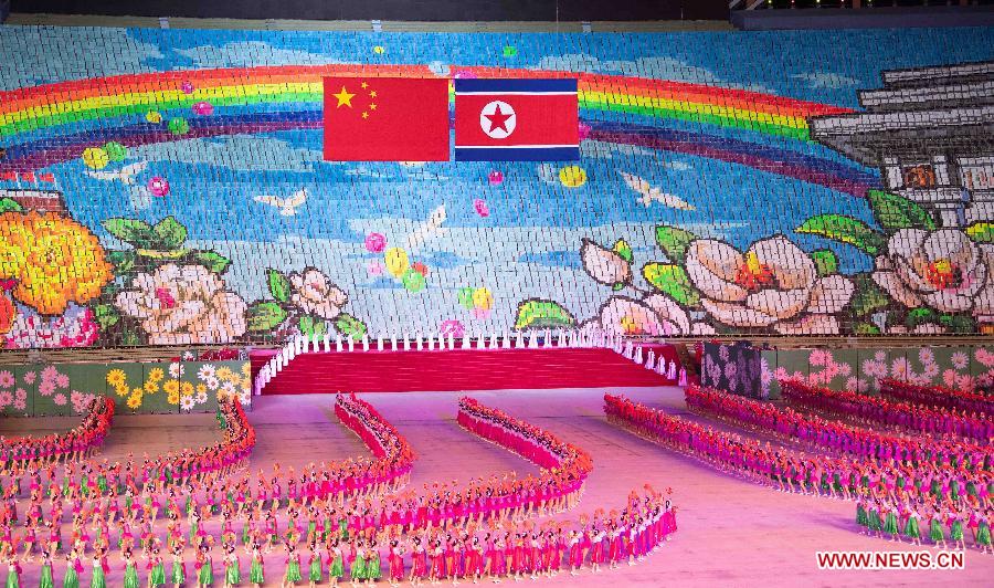 A large group callisthenics and art performance is held at the May Day Stadium in Pyongyang, DPRK, June 20, 2019. Xi Jinping, general secretary of the Central Committee of the Communist Party of China (CPC) and Chinese president, and his wife Peng Liyuan, accompanied by Kim Jong Un, chairman of the Workers' Party of Korea (WPK) and chairman of the State Affairs Commission of the Democratic People's Republic of Korea (DPRK) and his wife Ri Sol Ju, watched the perfromance here on Thursday. (Xinhua/Shen Hong)