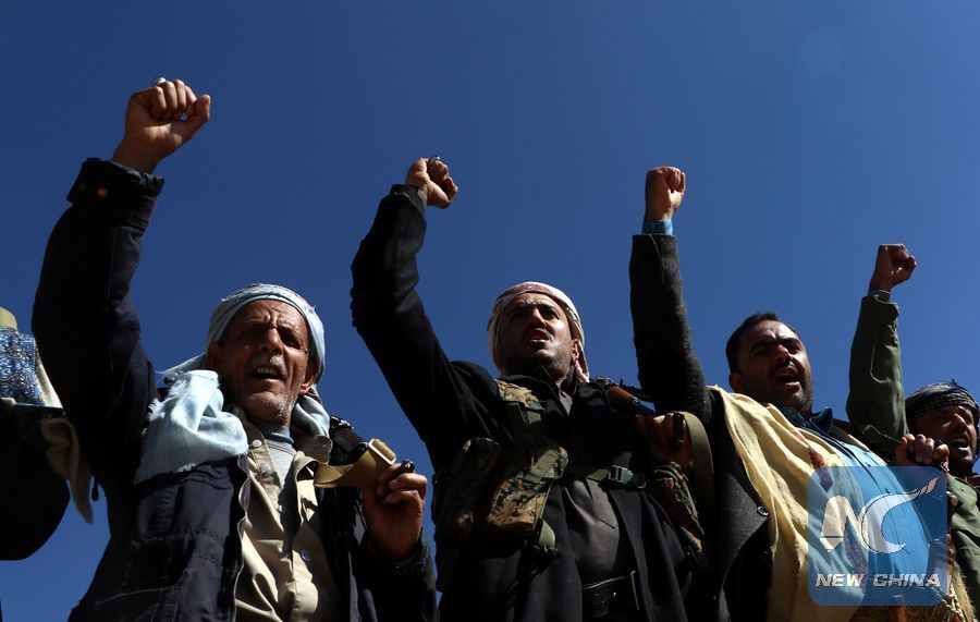 Yemen's Houthi followers shout slogans during a rally to celebrate and support the UN-brokered cease-fire in Hodeidah, in Sanaa, Yemen, on Dec. 19, 2018. (Xinhua/Mohammed Mohammed)