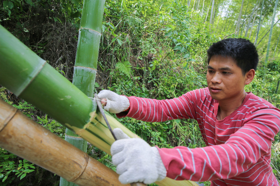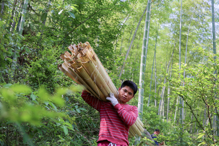 Li Qiugui conveys bamboo sticks at Taolin Village of Tantou Township in Longhui County, central China's Hunan Province, May 22, 2019. (Xinhua/Zeng Yong)