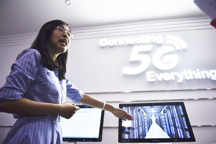 A China Mobile staff member introduces 5G technologies at an experience hall in Beijing. (Xinhua/Wu Gang)
