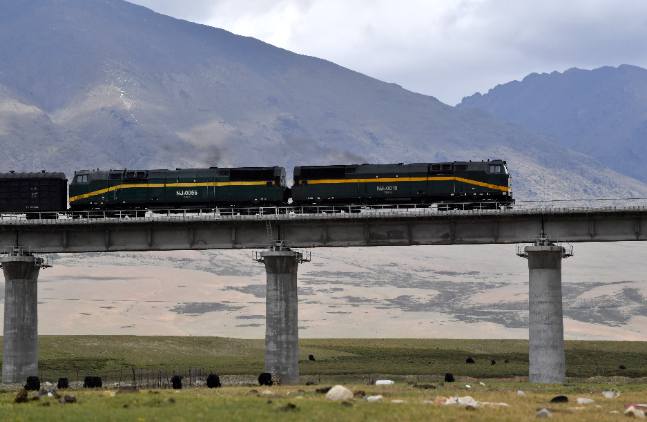 Photo taken on June 10, 2019 shows a train running on the Qinghai-Tibet Railway in China. (Xinhua/Chogo)