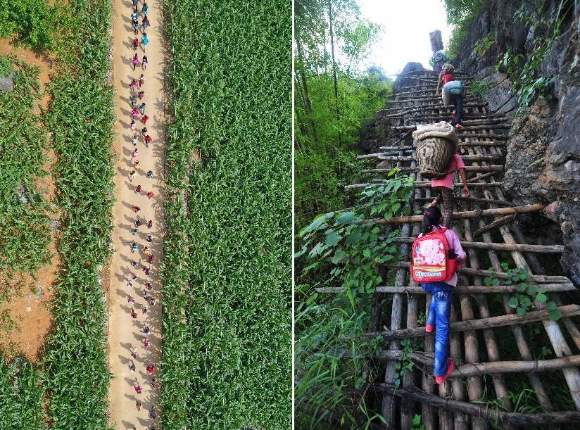 Combo photo shows children walking home on a road after school on May 10, 2019 (L) and children climbing ladders to go home on a mountain road on July 4, 2012 in Nongyong Village of Bansheng Township in Dahua Yao Autonomous County, south China's Guangxi Zhuang Autonomous Region. (Xinhua/Huang Xiaobang)