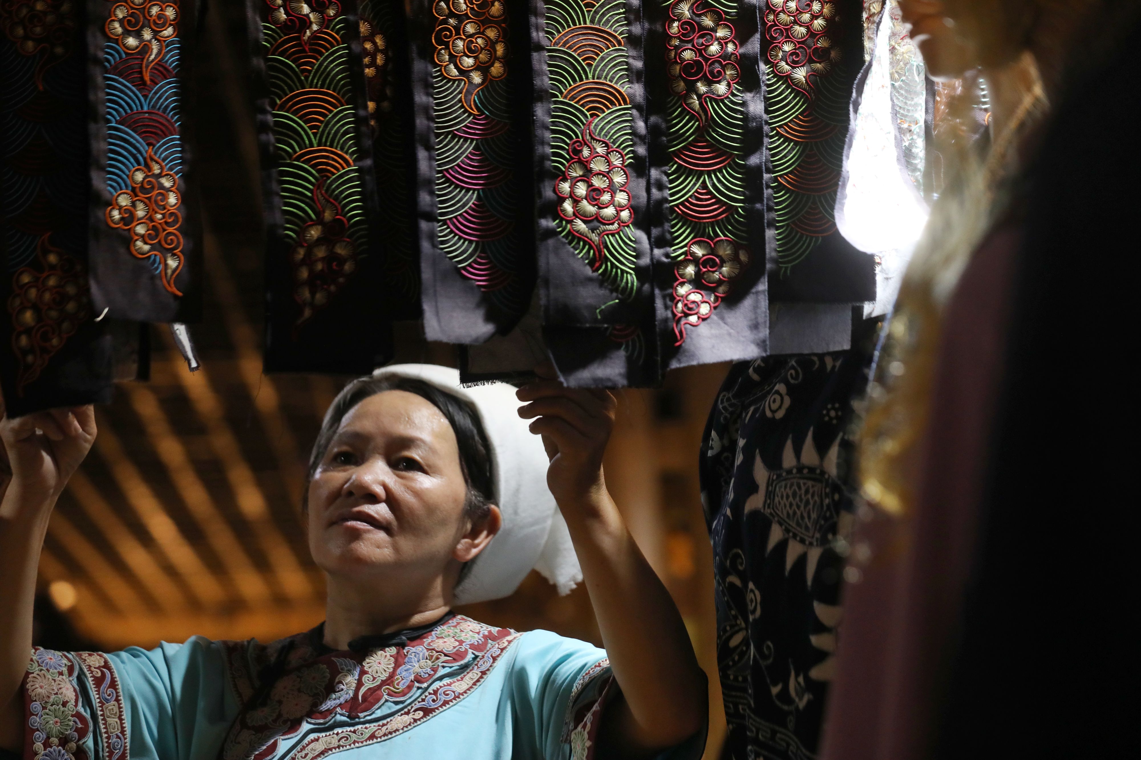 Wei Taohua examines a piece of finished horse tail embroidery. (Xinhua/Ou Dongqu)