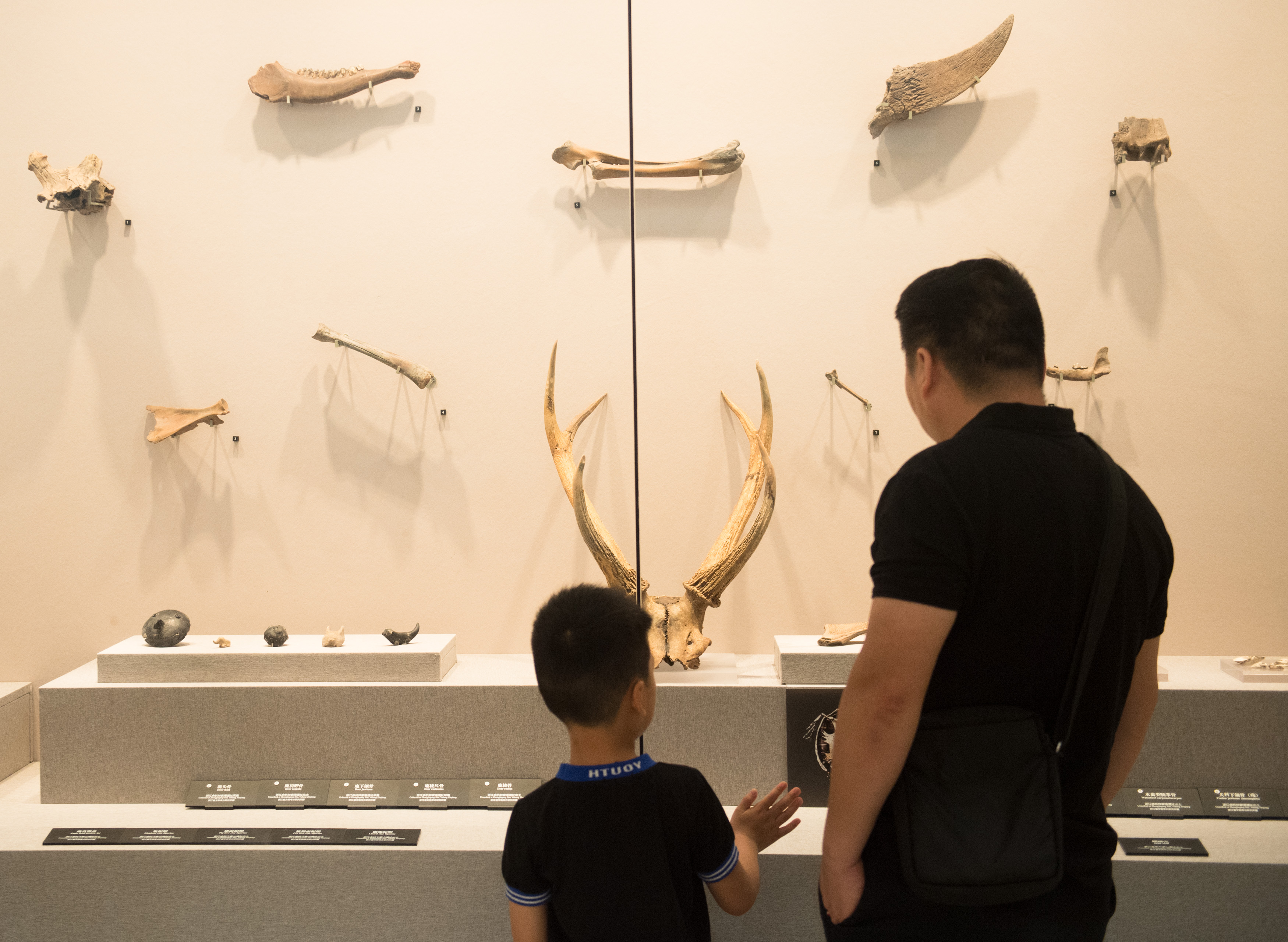 People look at excavated animal bones at Liangzhu Museum in Hangzhou, capital of east China's Zhejiang Province, June 22, 2019. (Xinhua/Weng Xinyang)