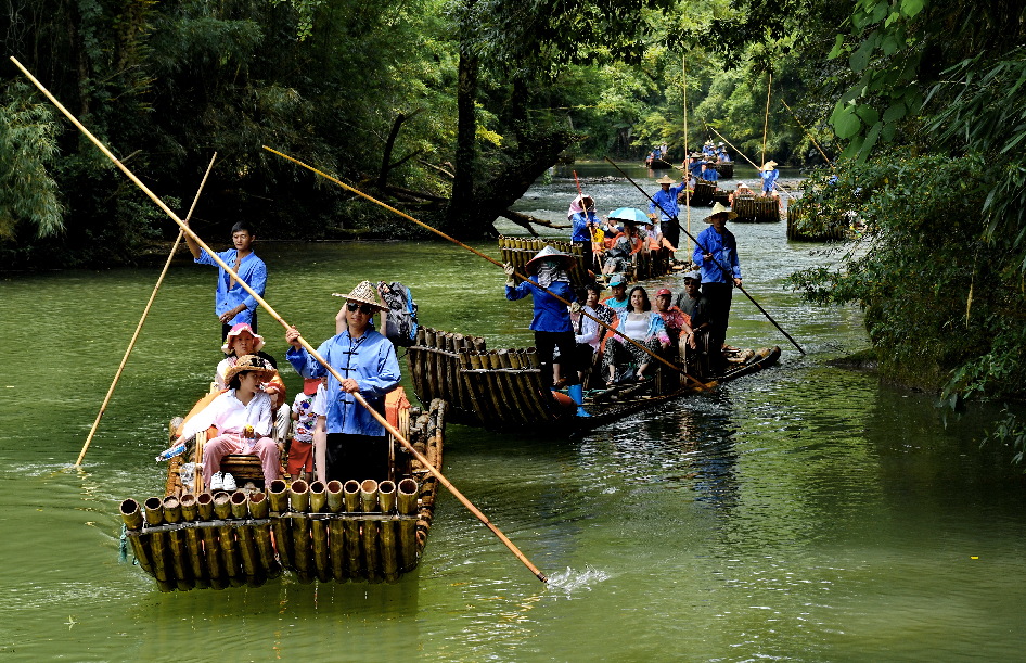 Tourists drift down a river at the Wuyi Mountain scenic spot in southeast China's Fujian Province, July 5, 2018. (Xinhua/Zhang Guojun)(mcg)