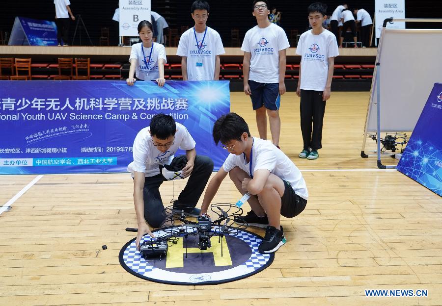 Contestants prepare an unmanned aerial vehicle (UAV) during the first International Youth UAV Science Camp & Competition (IYUAVSCC) in Xi'an, northwest China's Shaanxi Province, July 21, 2019. The first IYUAVSCC, launched by Chinese Society of Aeronautics and Astronautics (CSAA) and Northwestern Polytechnical University, kicked off here on Monday, attracting high school students from home and abroad. (Xinhua/Shao Rui)