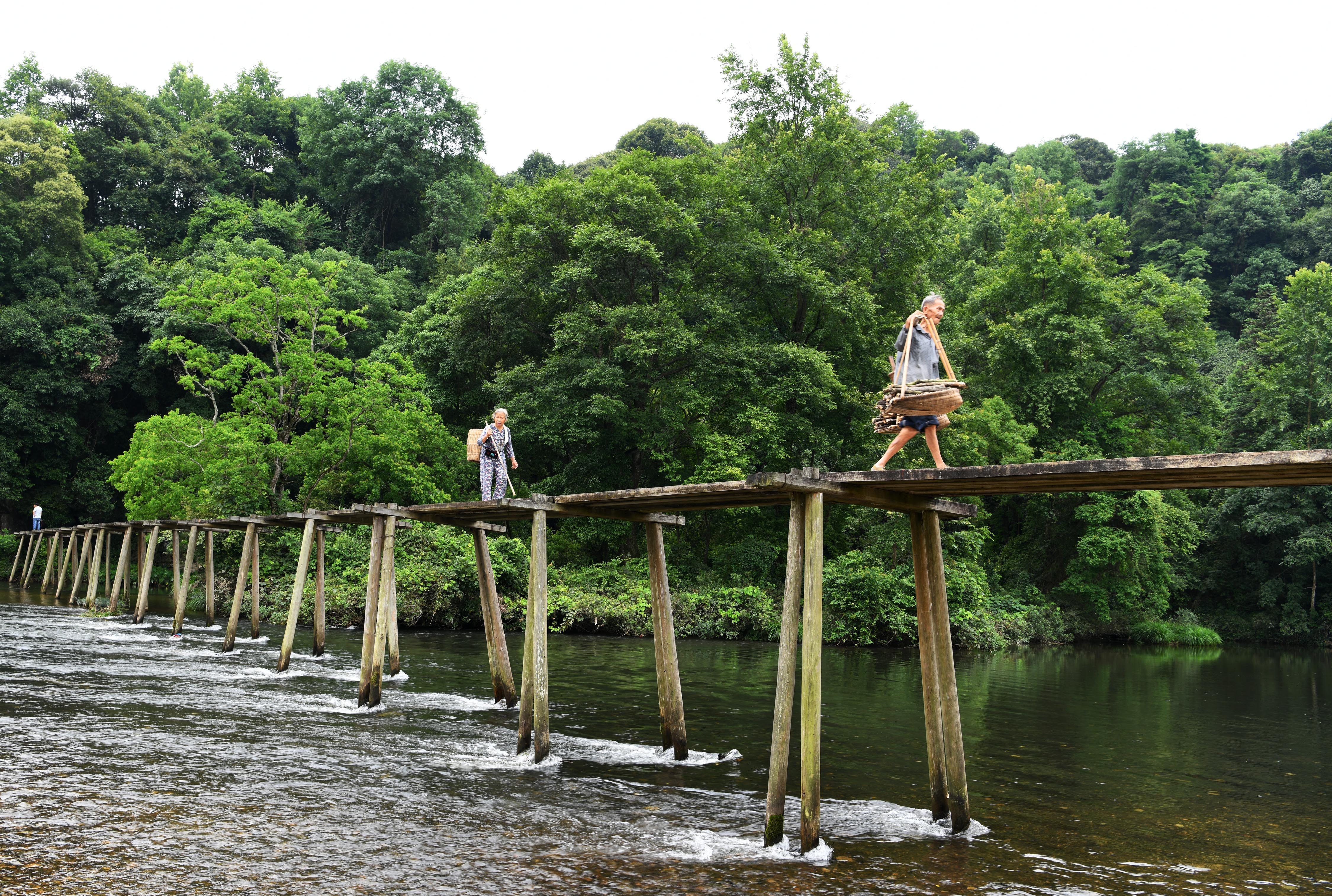 Villagers walk on a Red Army Bridge in Liping County, southwest China's Guizhou Province, July 2, 2019. (Xinhua/Yang Wenbin)