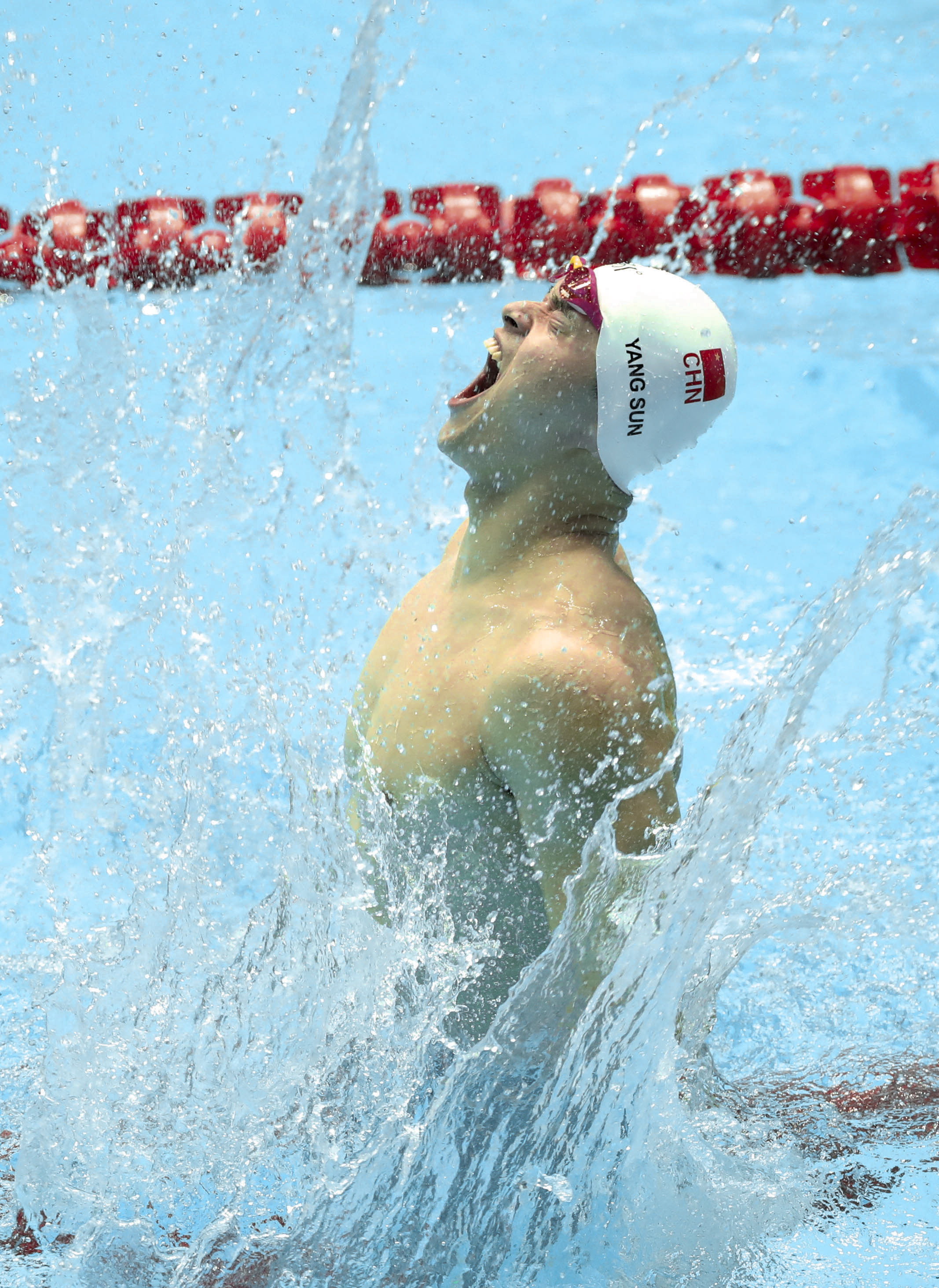 To rapturous cheers and applause, Sun celebrated his victory in front of the many Chinese fans in the arena, before sporting a patriotically-colored red and yellow tracksuit as he collected his gold medal.