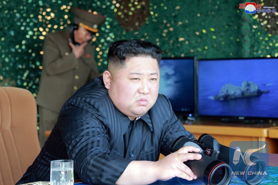 Photo provided by Korean Central News Agency (KCNA) on May 5, 2019 shows Kim Jong Un, top leader of the Democratic People's Republic of Korea (DPRK), guiding a strike drill of defense units. (Xinhua/KCNA)