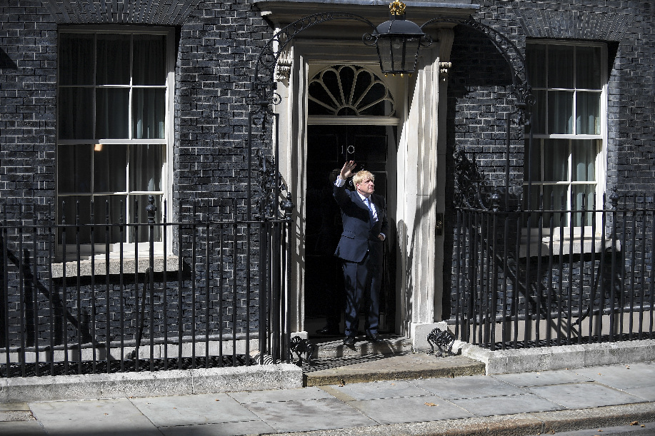 Britain's new Prime Minister Boris Johnson poses outside 10 Downing Street after his speech in London, Britain on July 24, 2019. Newly-elected Conservative Party leader Boris Johnson took office as the British prime minister on Wednesday amid the rising uncertainties of Brexit. (Photo by Alberto Pezzali/Xinhua)