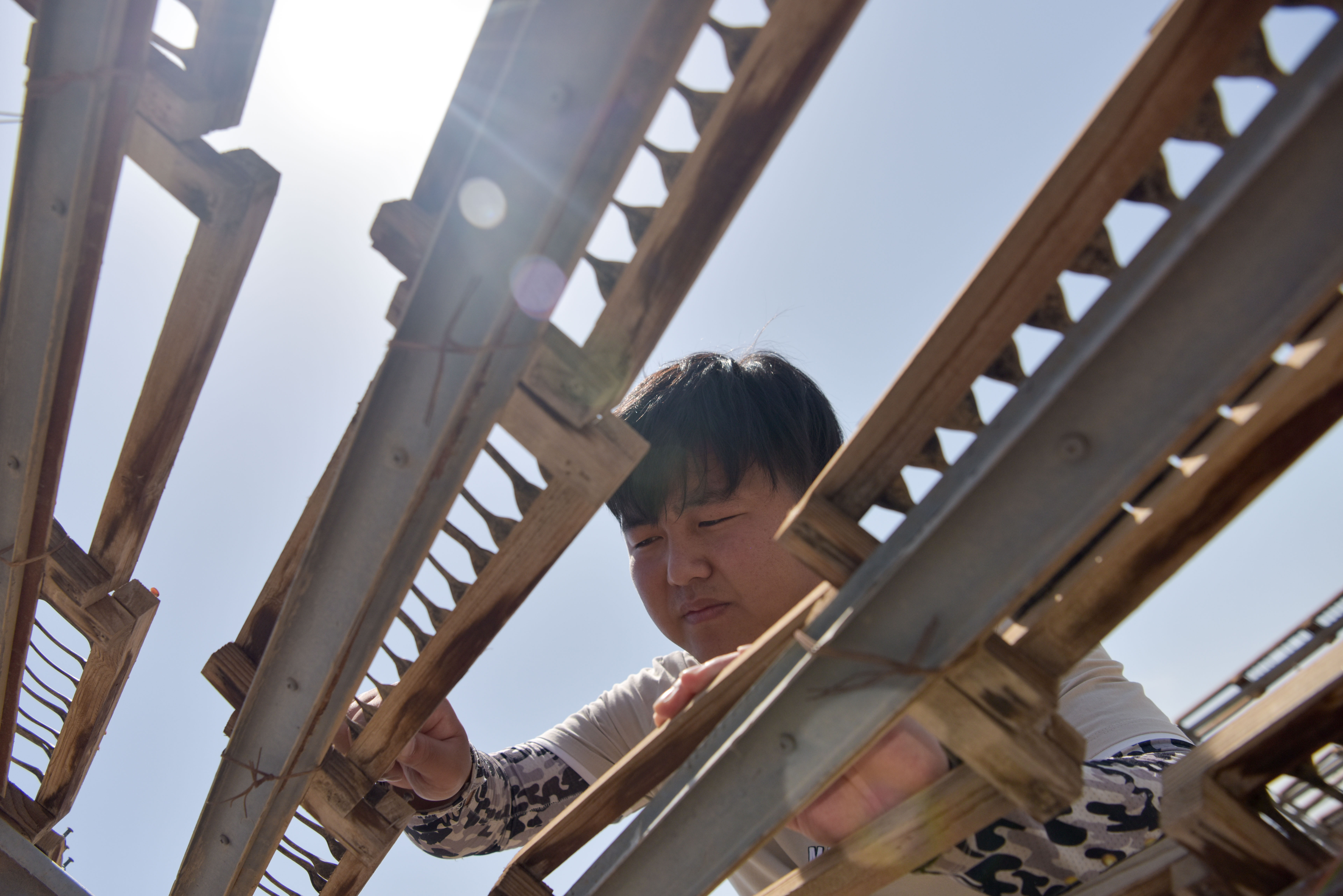 Aerial photo shows inspector You Liwu maintaining test items at an outside test area of the Xinjiang Turpan Natural Environment Experimental Research Center in Turpan, northwest China's Xinjiang Uygur Autonomous Region, July 17, 2019. (Xinhua/Ding Lei)