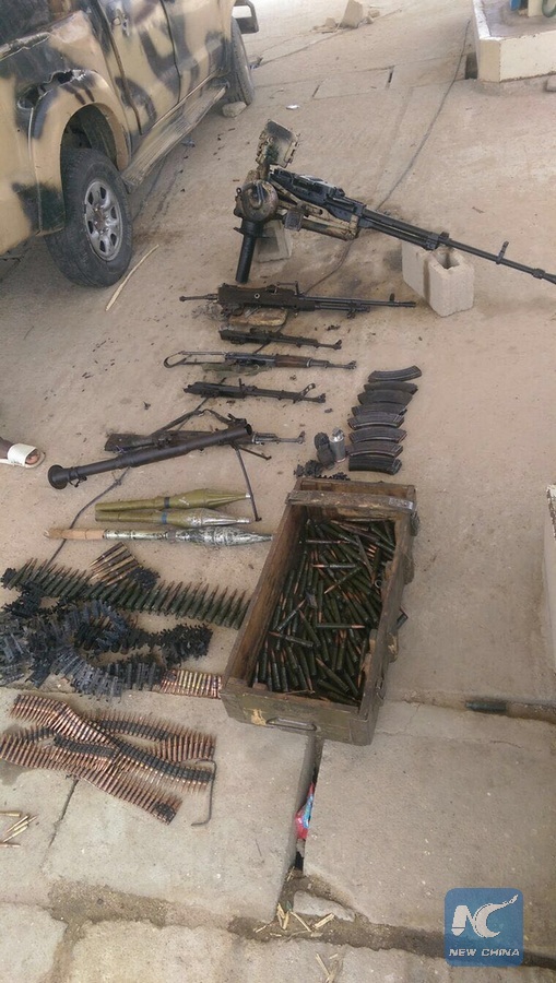 File photo provided by the Nigerian military shows weapons captured during operations againstBoko Haram terrorists in Nigeria's northeastern state of Borno, Nigeria, Feb. 24, 2016. (Xinhua)