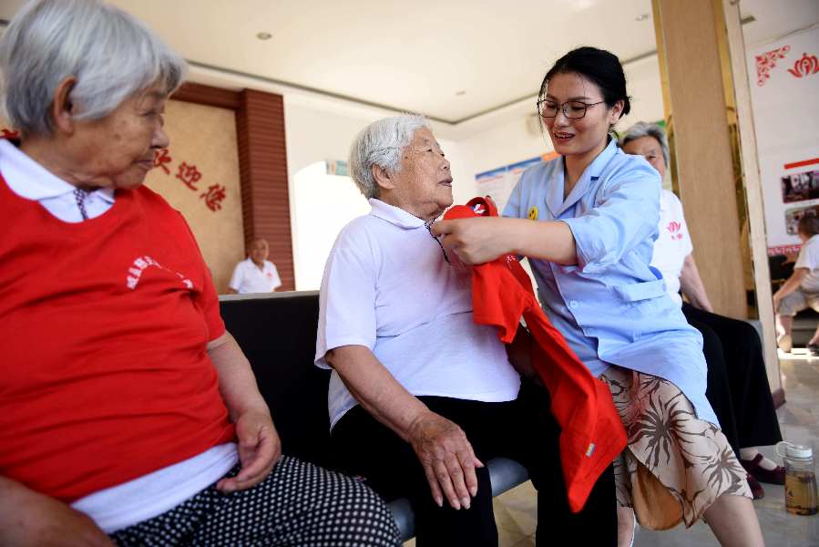 A nurse helps the elderly wear clothes in Zhangtai Township of Weixian County in Xingtai City, north China's Hebei Province, June 12, 2019. (Xinhua/Zhu Xudong)