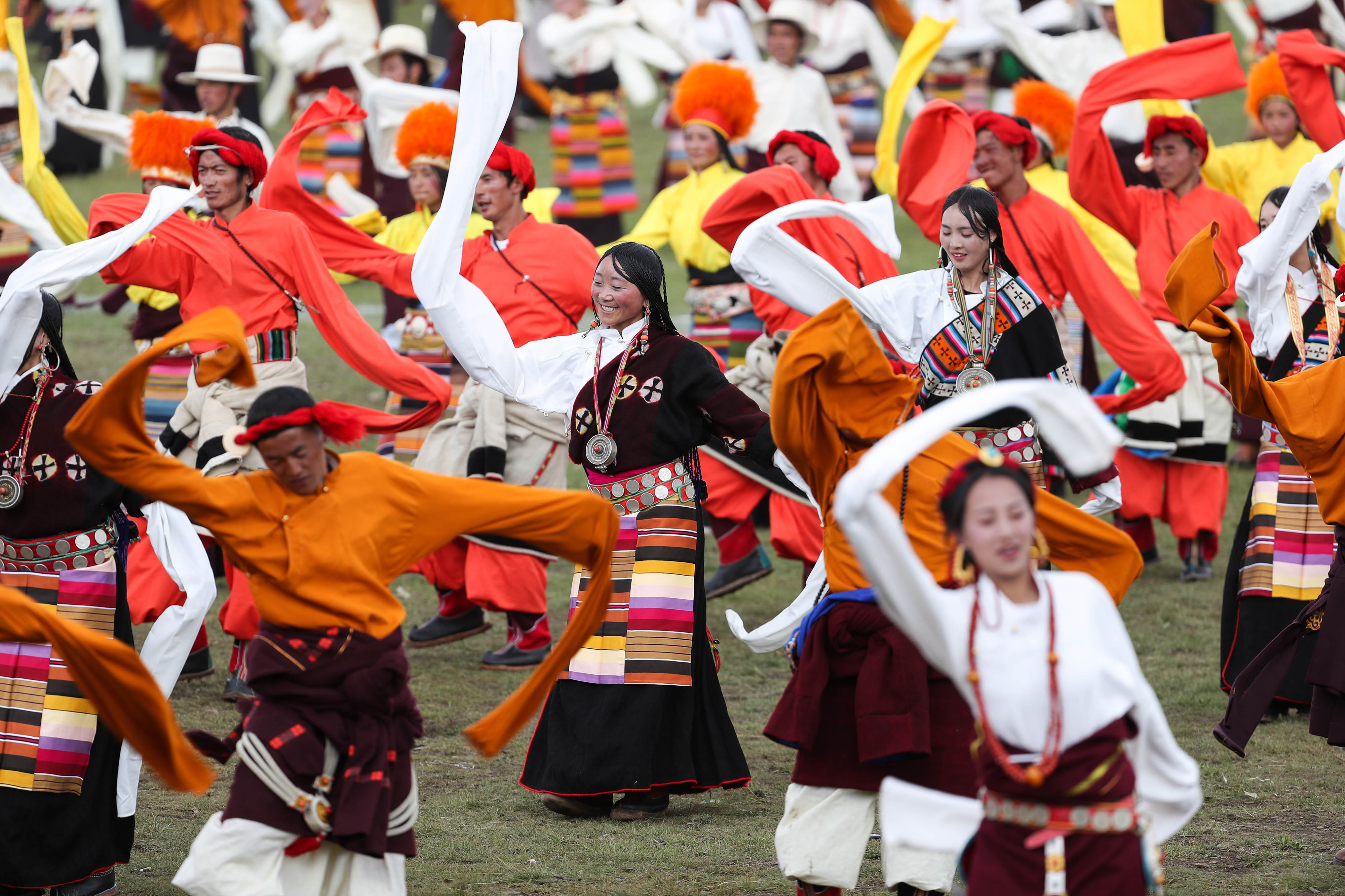 People perform Guozhuang dance, or Tibetan bonfire dance, on the opening ceremony of a horse racing festival in Litang County, southwest China's Sichuan Province, July 30, 2019. (Xinhua/Jiang Hongjing)