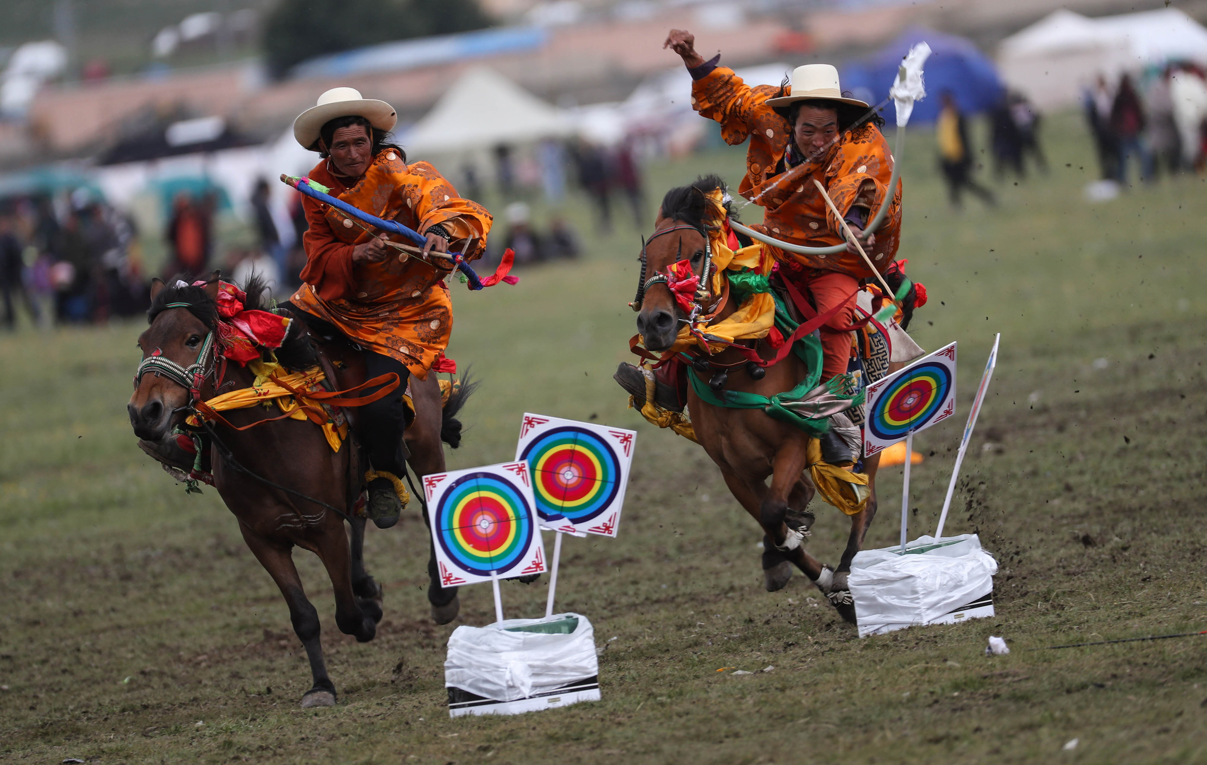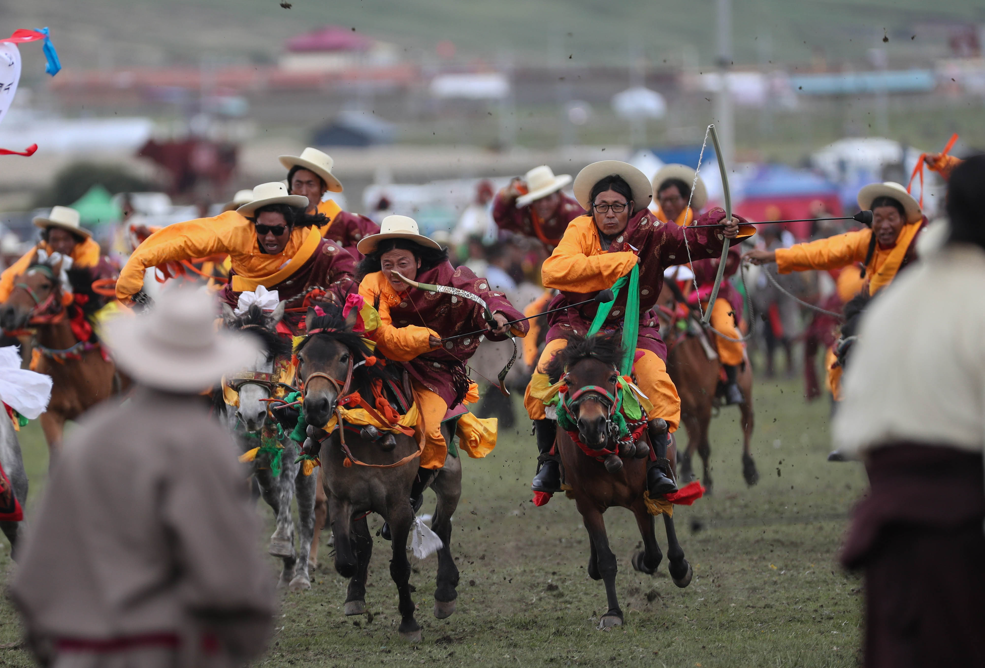 LITANG, Aug 1, 2019 (Xinhua) -- Nearly 1,000 herdsmen took part in a grand horse racing festival in Litang County, southwest China's Sichuan Province. It is an annual horse racing festival for local herdsmen of Tibetan ethnic group. Amid the festive atmosphere full of excitement and joy, Tibetan herdsmen presented their ethnic-style horse races, including archery contest on the horse and picking up hada on the horse, as part of the equestrianism demonstrations.
