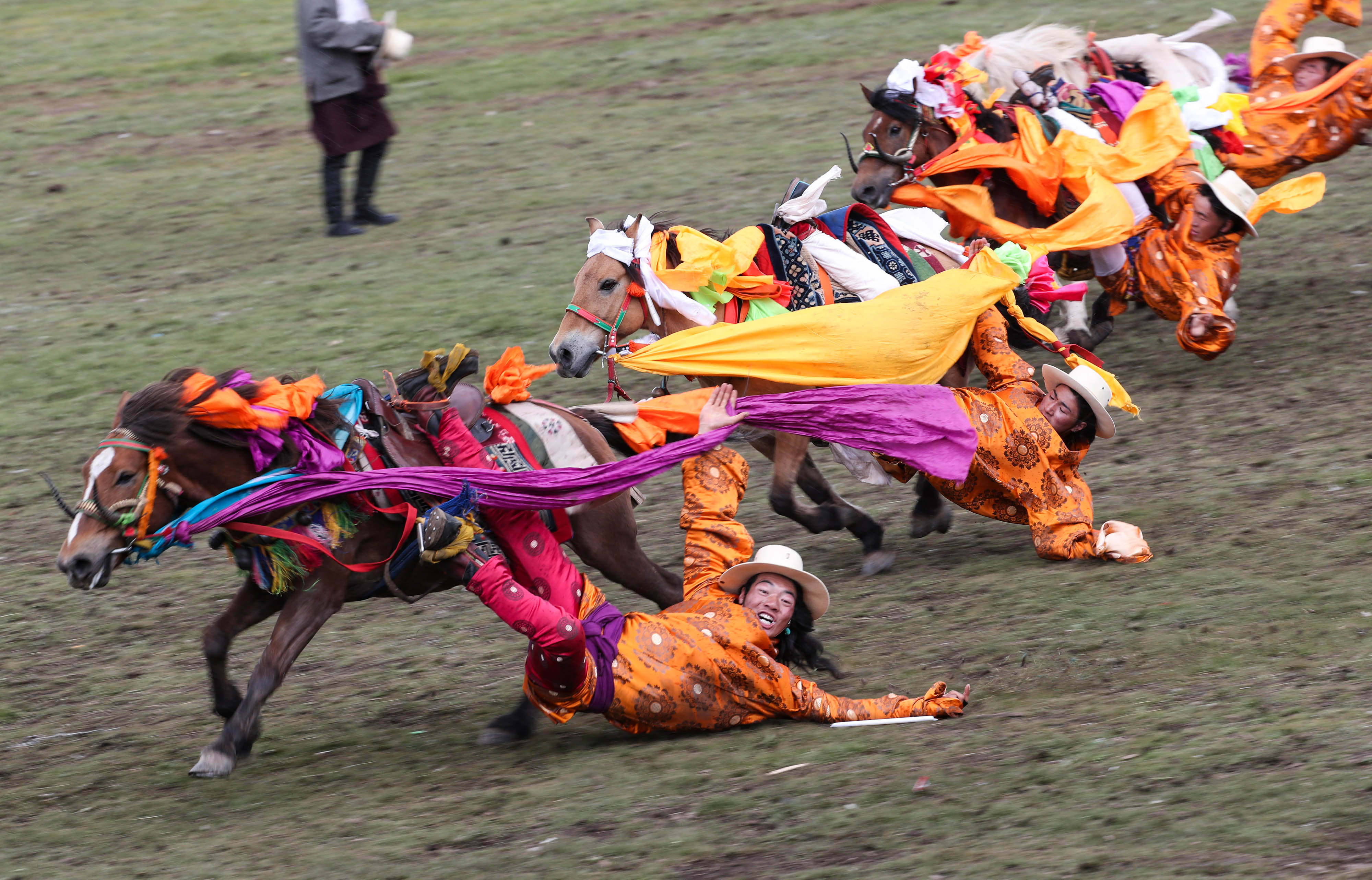 A rider performs horsemanship during a horse racing festival in Litang County, southwest China's Sichuan Province, July 30, 2019. (Xinhua/Jiang Hongjing)
