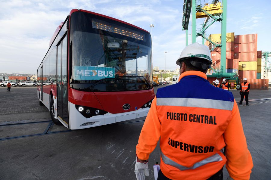 An electric bus, manufactured by Chinese company BYD, arrives in the port of San Antonio, in the region of Valparaiso, Chile, July 31, 2019. (Xinhua/Jorge Villegas)