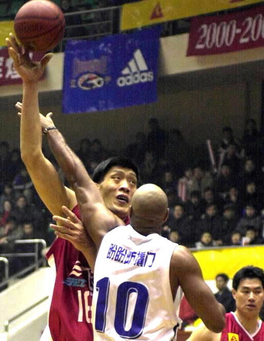 Yu Leping of Zhejiang (L) lays up during the match against Liaoning in China's premier basketball league on February 4, 2001. (Xinhua/Guo Dayue)