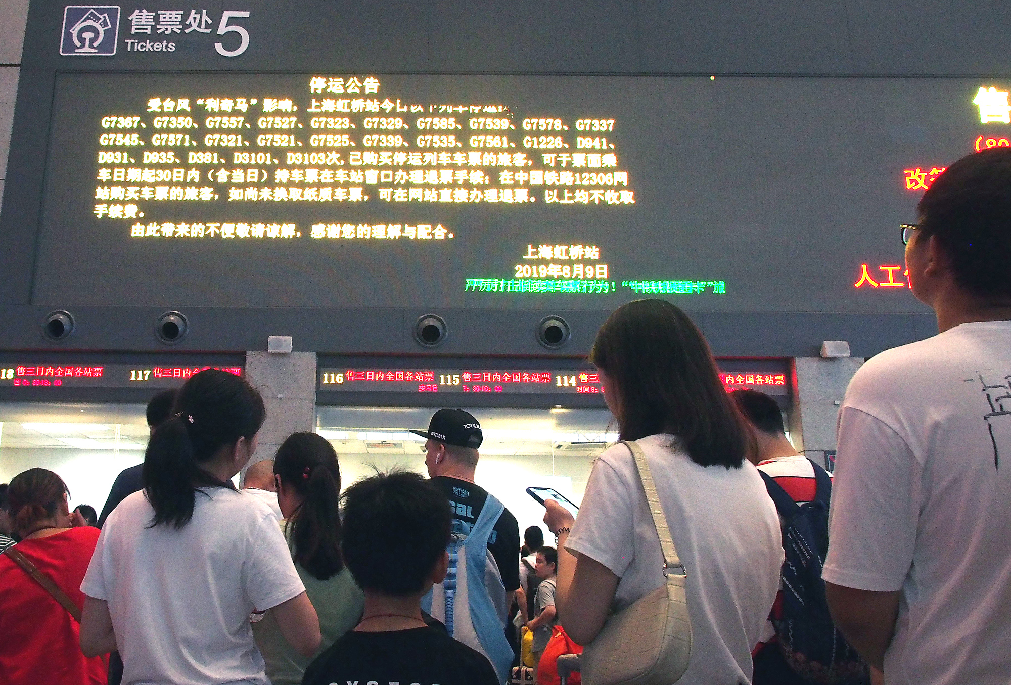 Passengers queue to refund or reschedule their journeys at Hongqiao Railway Station in east China's Shanghai, Aug. 9, 2019. (Xinhua/Chen Fei)