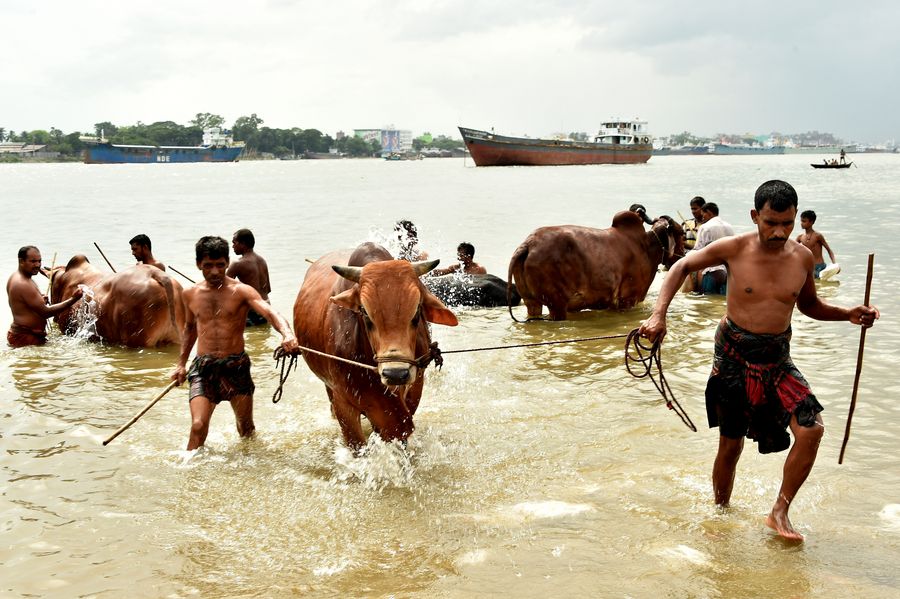 Traders bath cattle in a river in Dhaka, Bangladesh, on Aug. 7, 2019. (Str/Xinhua)