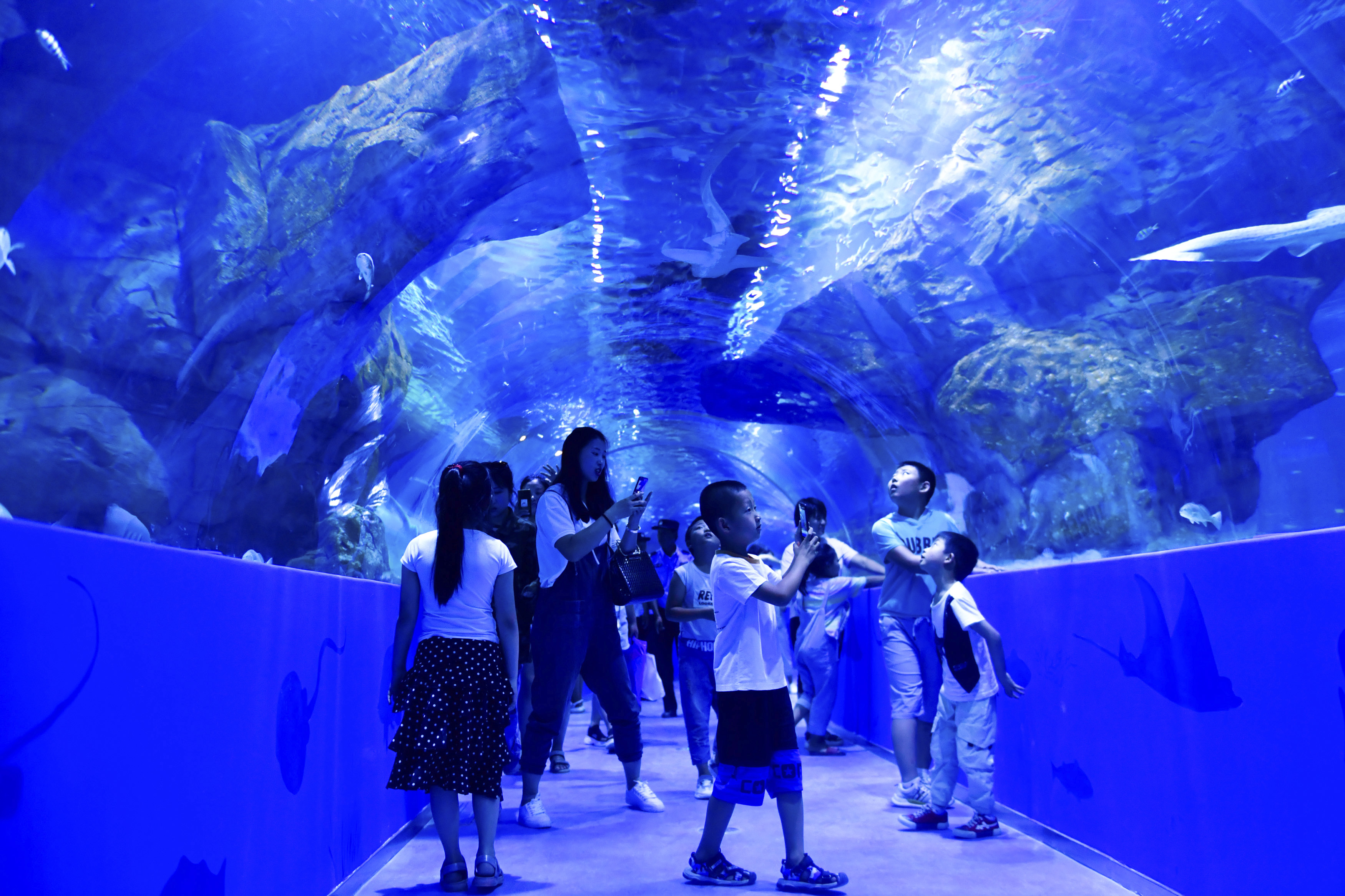 Photo taken on Aug. 18, 2019 shows visitors in the world's highest-altitude aquarium in northwest China's Qinghai Province. (Xinhua/Zhang Long)