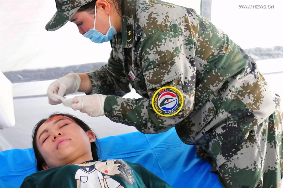 Participants take part in the drills during the "Peace Train-2019" China-Laos humanitarian and medical joint rescue exercise in Vientiane, capital of Laos, Aug. 18, 2019. (Xinhua/Zhang Jianhua)