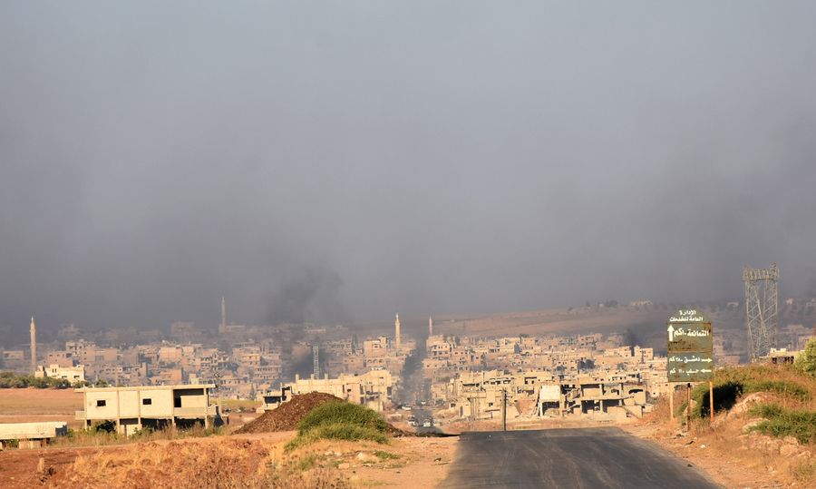 Smoke rises from the town of Khan Shaykhun, Idlib, Syria, on Aug. 22, 2019. (Xinhua)