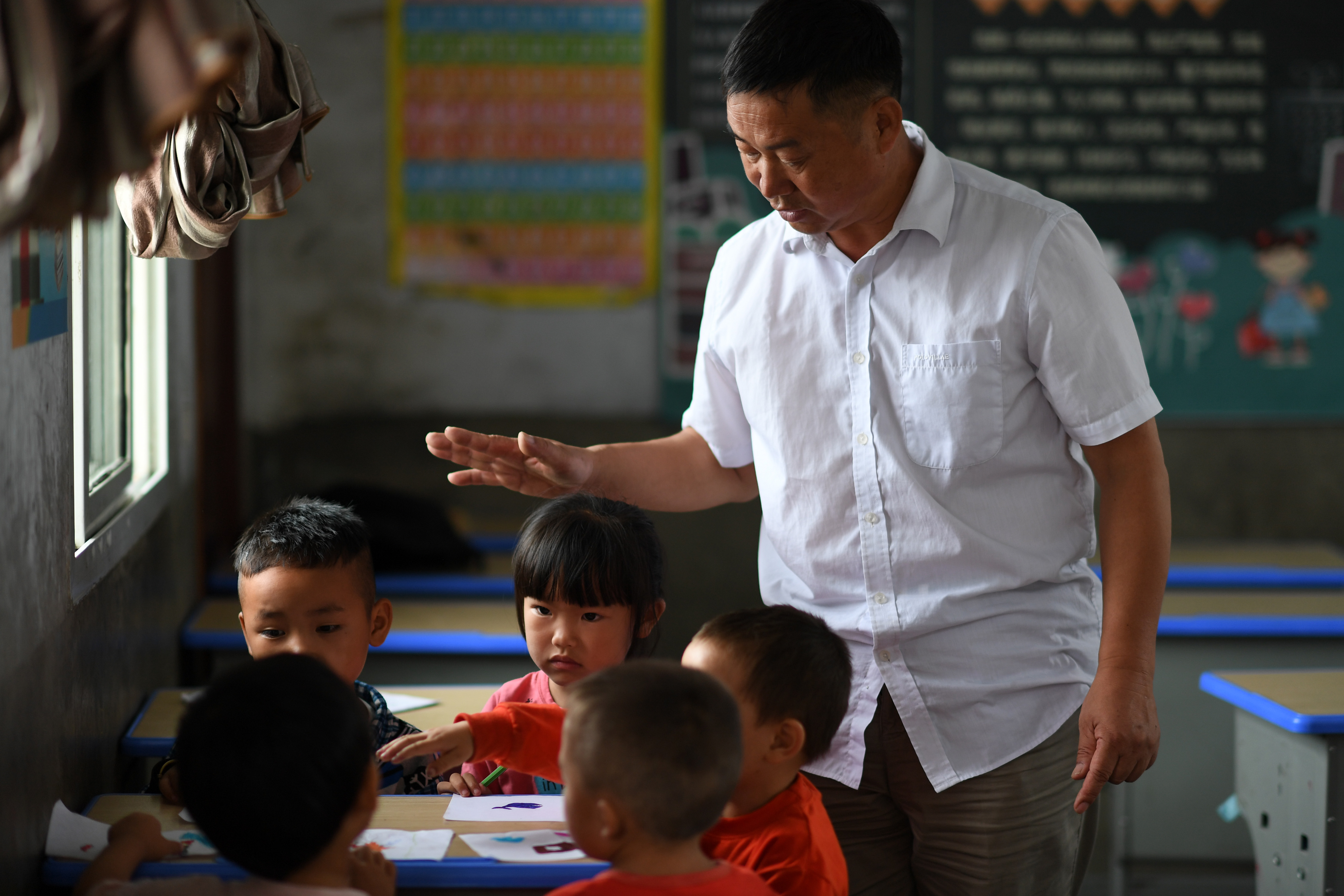 Wu Guoxian teaches drawing to preschool students at Gugang Primary School in Liuguang Village of Longli County in Bouyei-Miao Autonomous Prefecture of Qiannan, southwest China's Guizhou Province, Aug. 27, 2019.(Xinhua/Yang Wenbin)