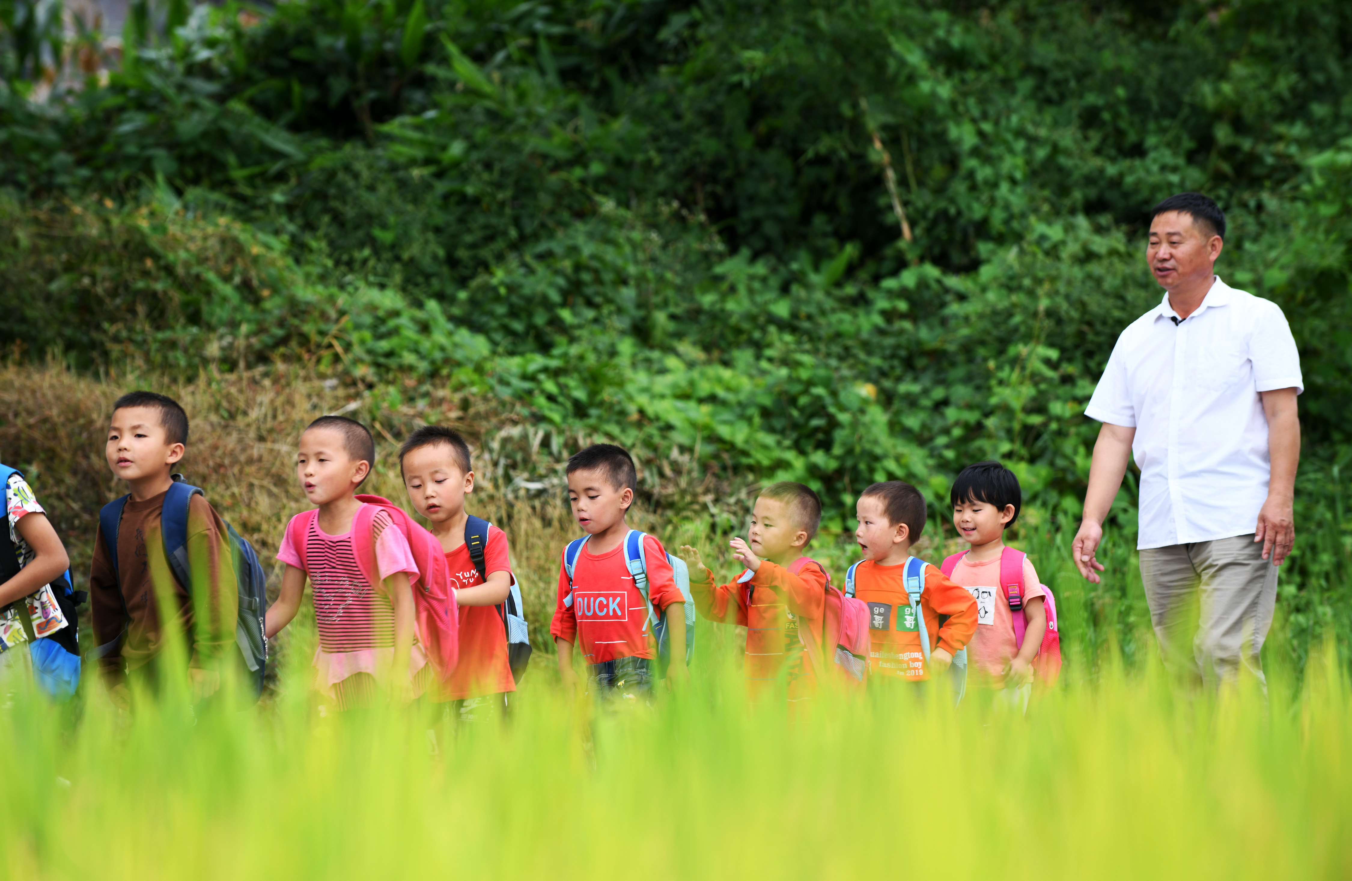 Students are escorted by Wu Guoxian to go home at Liuguang Village of Longli County in Bouyei-Miao Autonomous Prefecture of Qiannan, southwest China's Guizhou Province, Aug. 26, 2019. (Xinhua/Yang Wenbin)