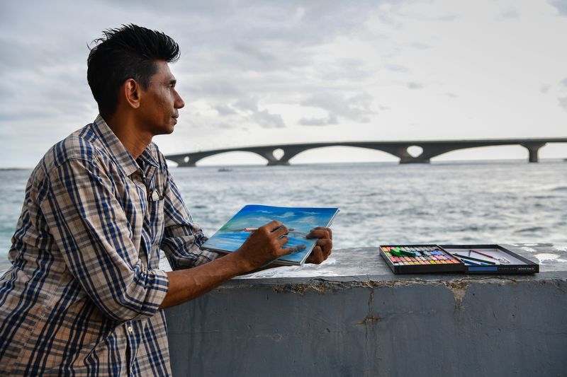 Artist Ali Amir works on a painting of the China-Maldives Friendship Bridge near the bridge in the Maldives, Aug. 27, 2019. (Xinhua/Du Cailiang)