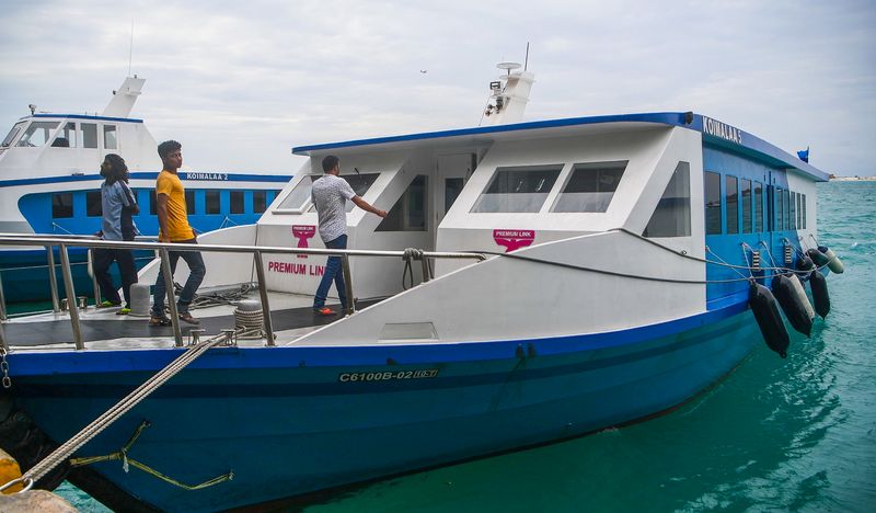 Passengers board a ferry at a pier in Hulhumale, the Maldives, Aug. 29, 2019. For years, Maldivians have relied on ferries as their means of transport between the atolls. (Xinhua/Du Cailiang)