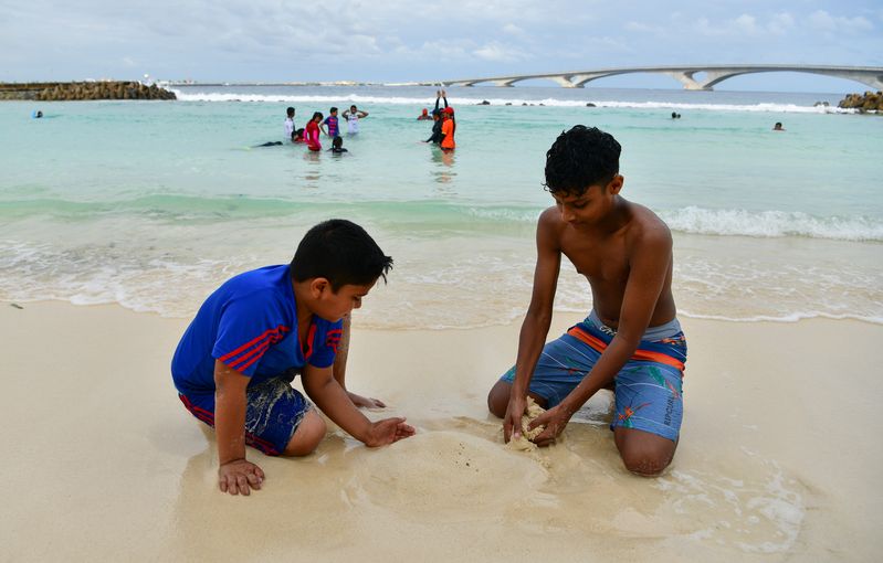 Two boys play on the beach near the China-Maldives Friendship Bridge in the Maldives, Aug. 27, 2019. (Xinhua/Du Cailiang)