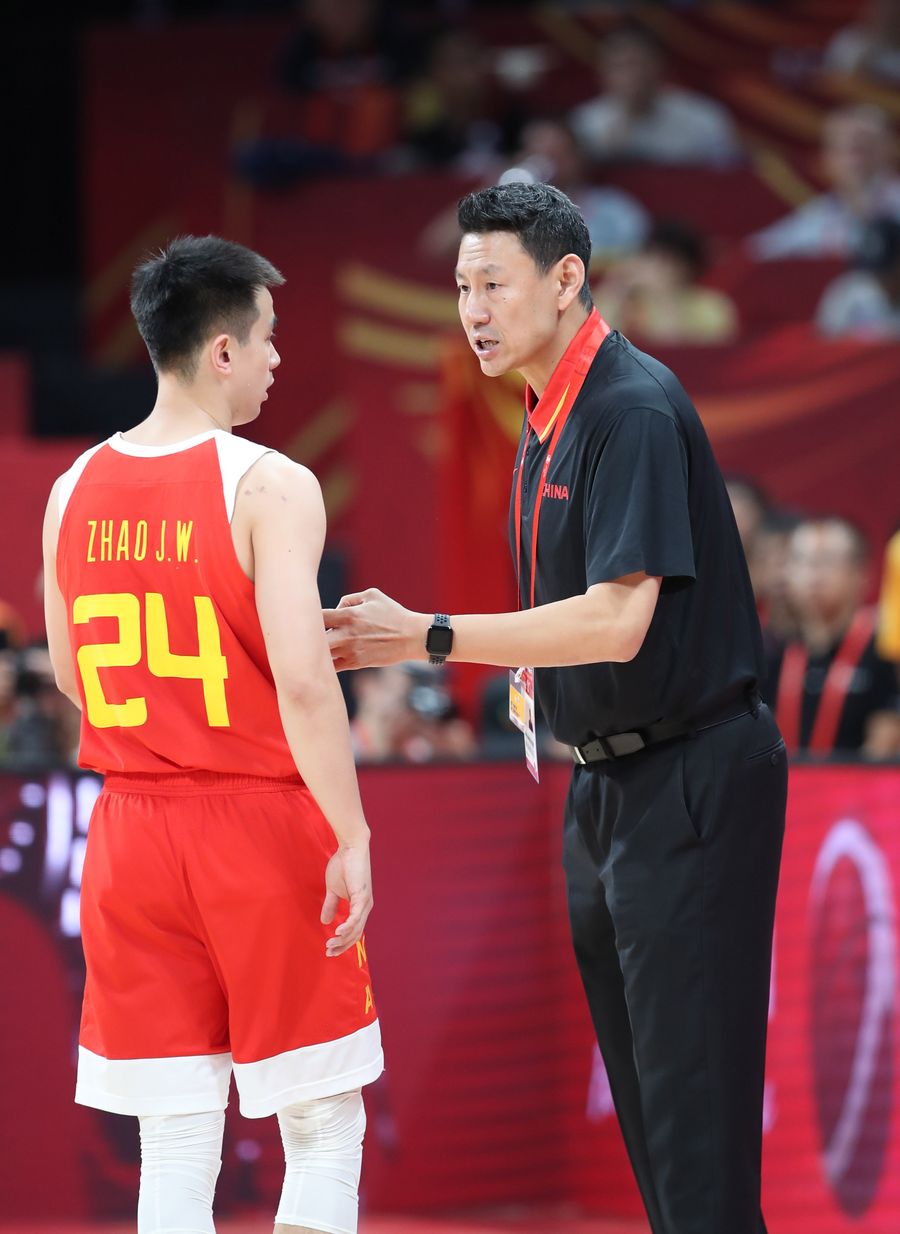 Li Nan(R), head coach of China, gives instructions to Zhao Jiwei during the group A match between China and Cote d'Ivoire at the FIBA Basketball World Cup 2019 in Beijing, on Aug. 31, 2019. (Xinhua/Meng Yongmin)