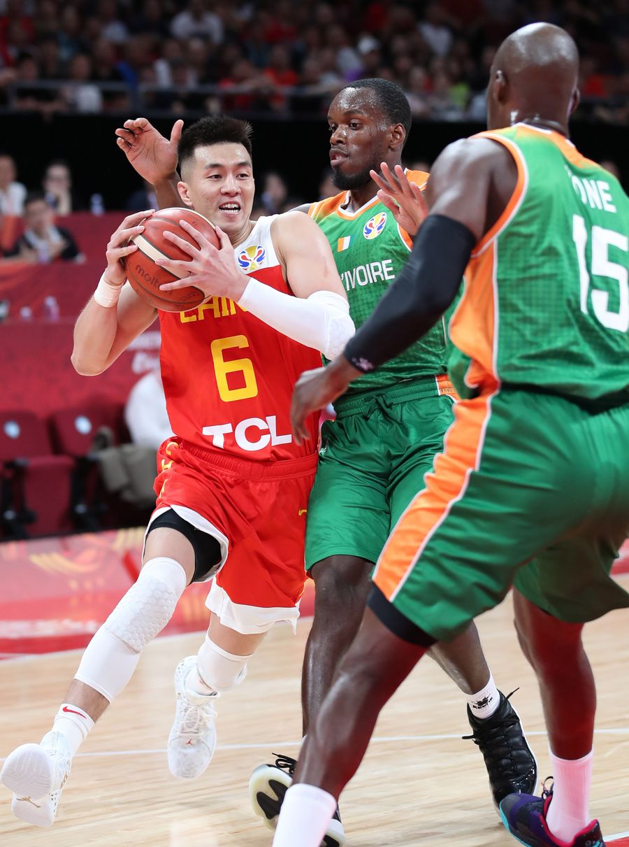 Guo Ailun (L) of China competes during the group A match between China and Cote d'Ivoire at the FIBA Basketball World Cup 2019 in Beijing, on Aug. 31, 2019. (Xinhua/Meng Yongmin)