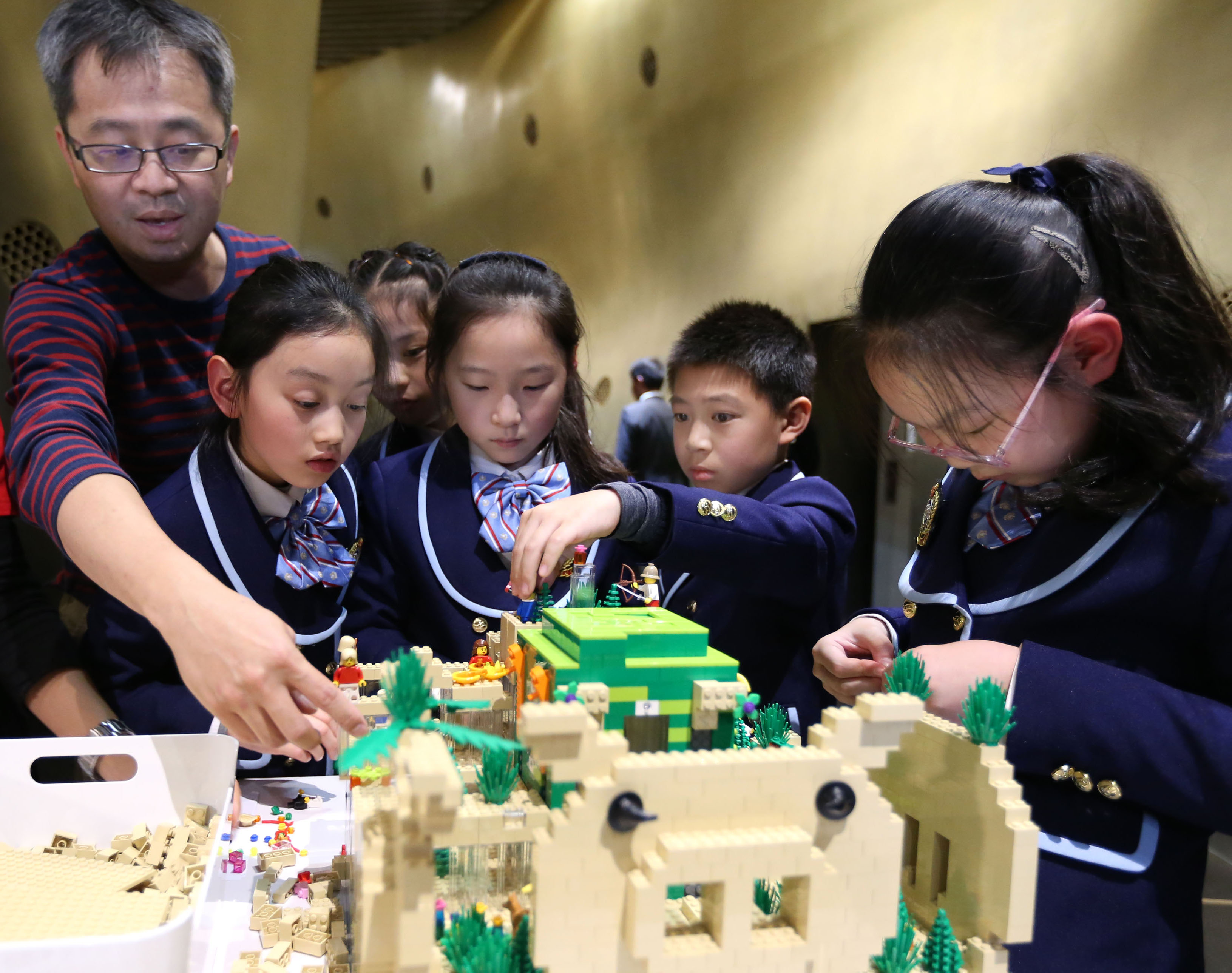 Children build the "Vertical City" model guided by a LEGO Certified Professional at Shanghai Tower, China's tallest building. (Xinhua/Ren Long)