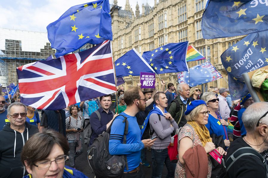 Anti-Brexit protesters take part in a demonstration in London, Britain, on Sept. 3, 2019. (Photo by Ray Tang/Xinhua)