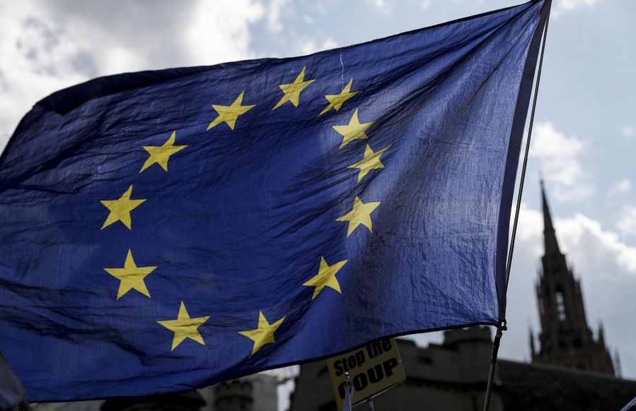 A flag of the European Union is seen outside the Houses of Parliament in London, Britain, Sept. 4, 2019. (Xinhua/Han Yan)