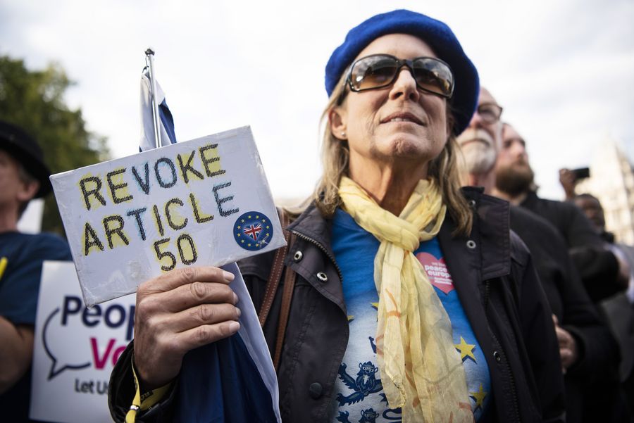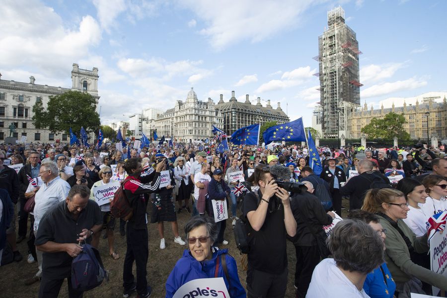 Demonstrators gather outside the Houses of Parliament in London, Britain, on Sept. 4, 2019. (Photo by Ray Tang/Xinhua)