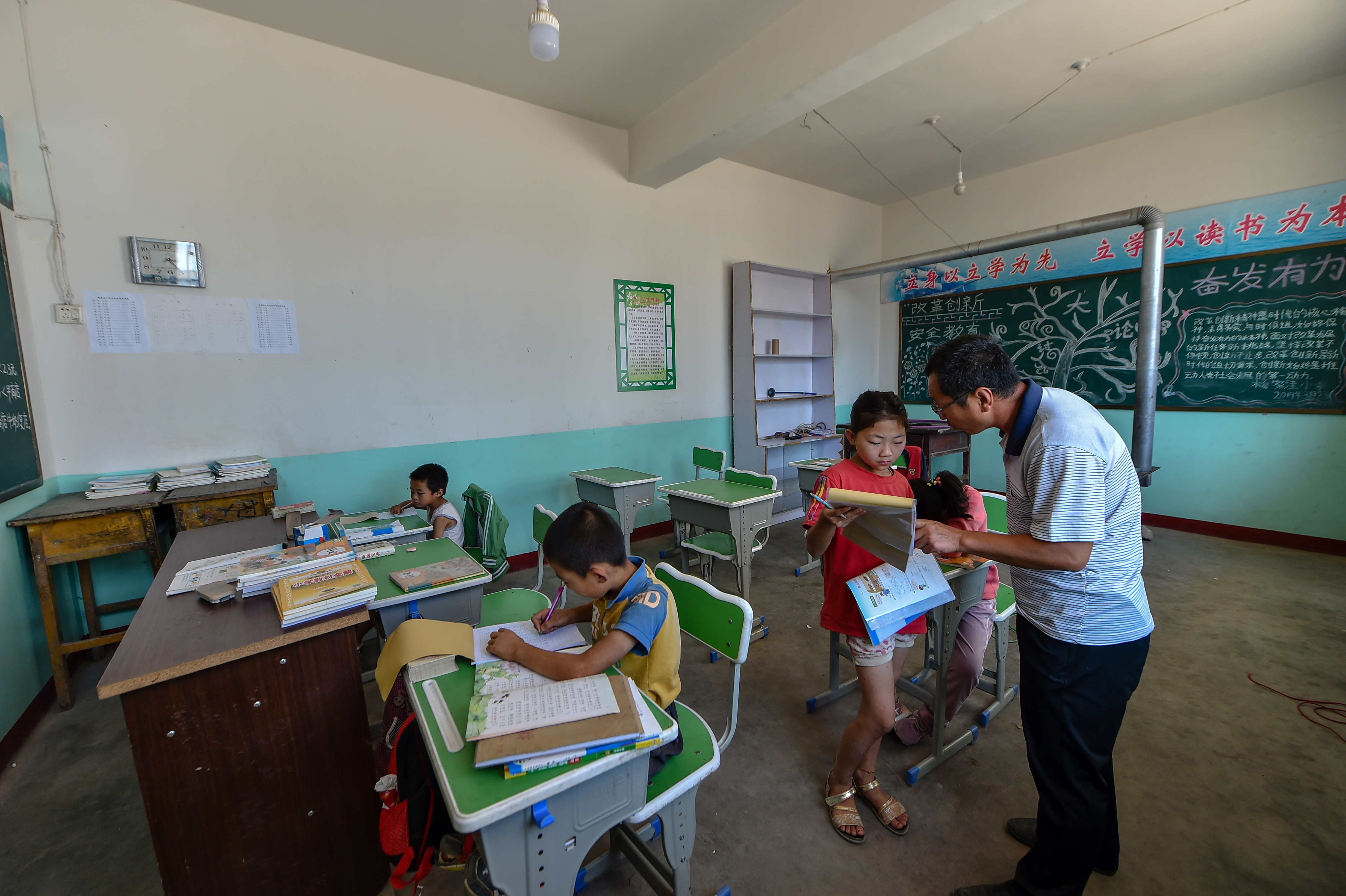 Rural teacher Wang Fuping tutors students with their homework at Yangjiawa primary school in Yangjiawa village of Gaojiagou township of Liulin county, Lyuliang, north China's Shanxi Province. (Xinhua/Zhan Yan)