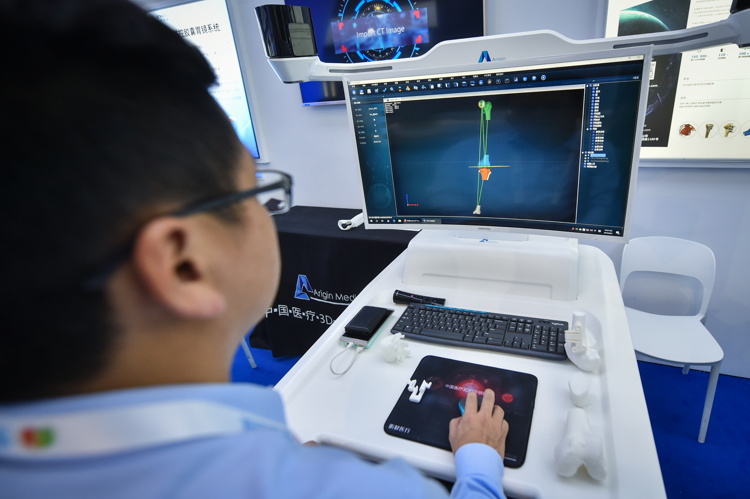 A staff displays a medical 3D-printing mobile workstation on the expo. (Xinhua/Li Mangmang)