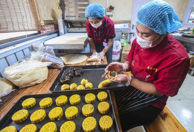 Shop assistants make handmade mooncakes at a cake shop in Yongqing Township of Yongqing County, north China's Hebei Province, Sept.10, 2019. (Xinhua/Li Xiaoguo)