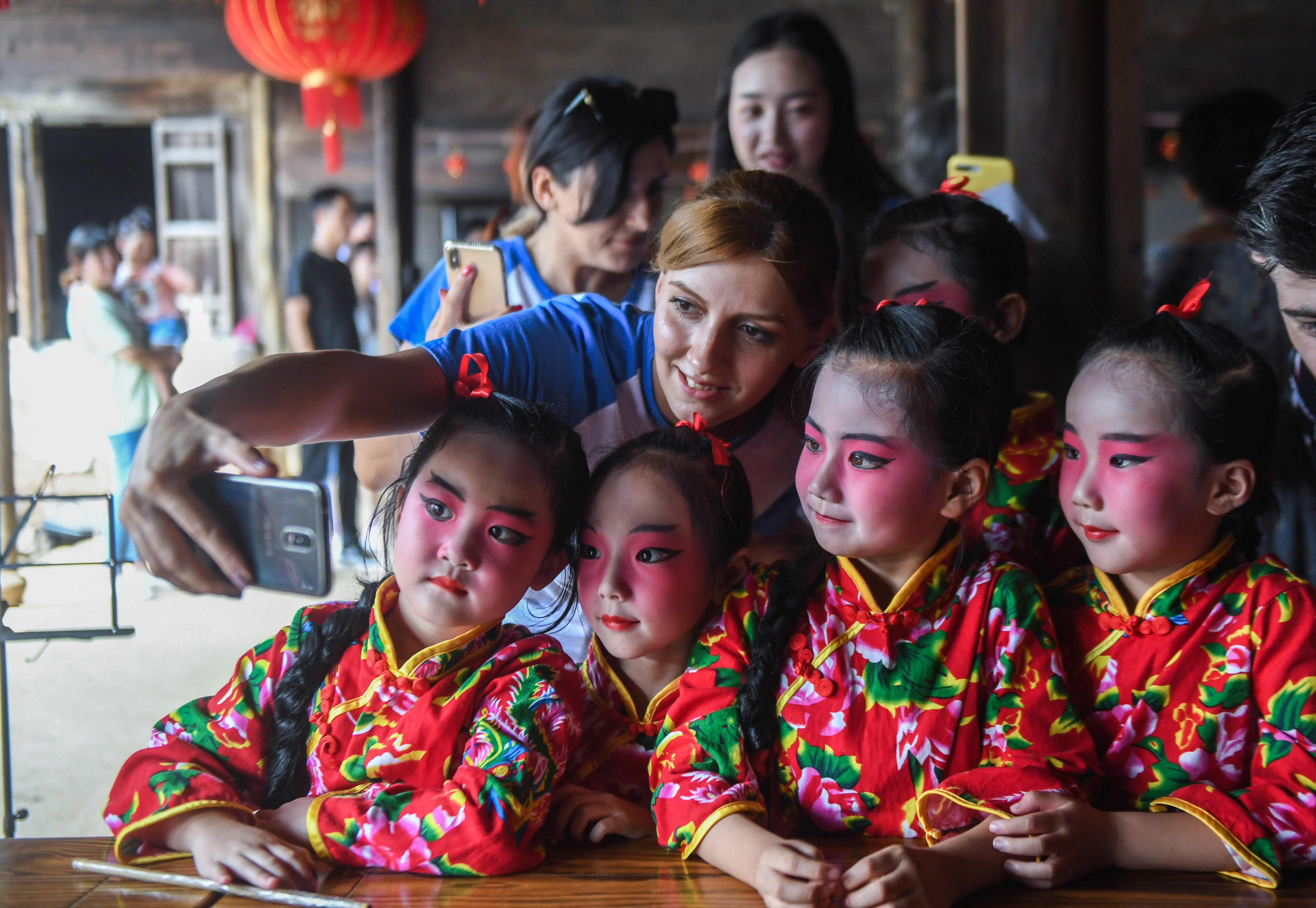 A girl from Armenia takes photos with kids from a Peking Opera performance group in Xiaopu Town, Changxing County of east China's Zhejiang Province, Sept. 11, 2019. (Xinhua/Xu Yu)