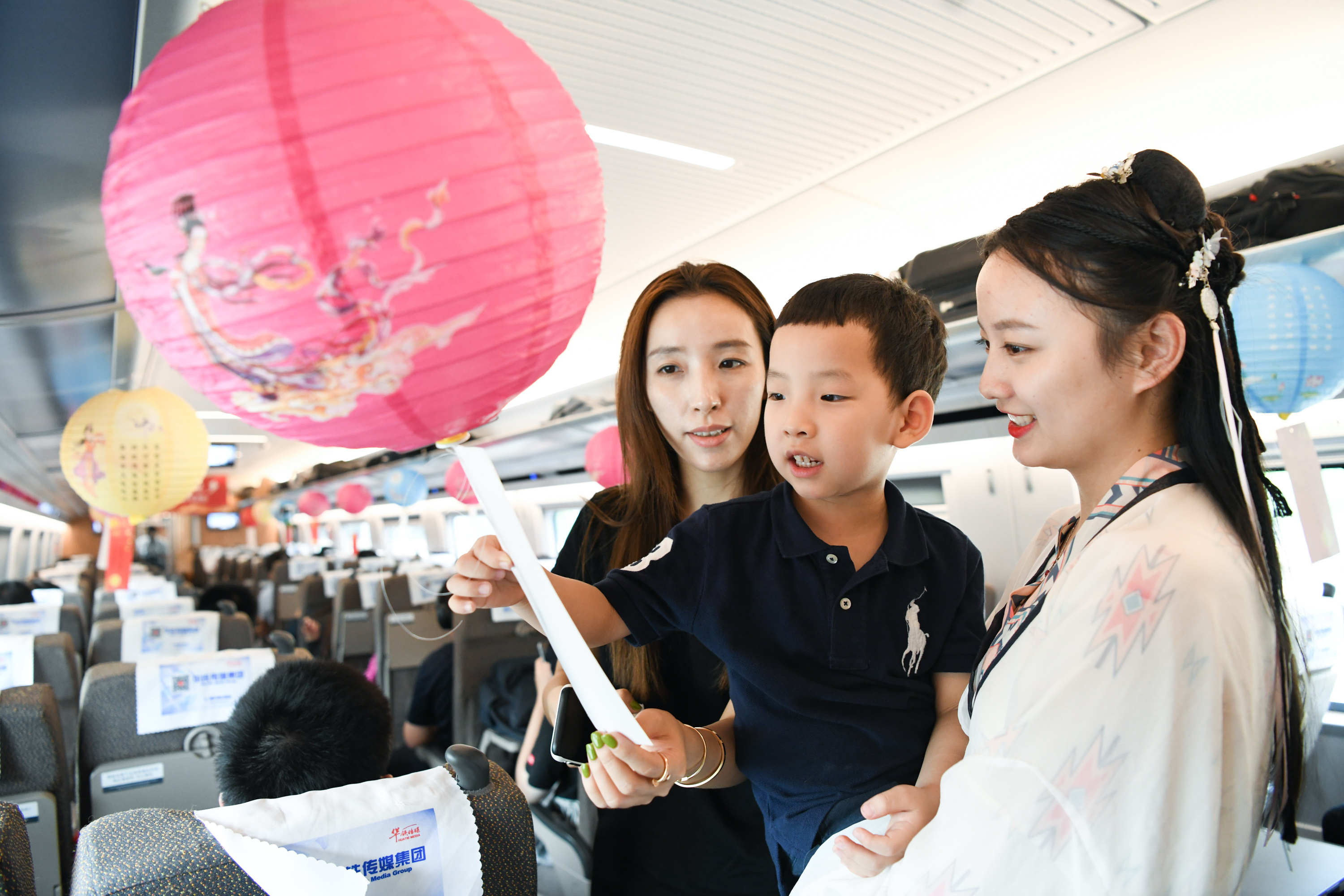 A train stewardess (1st R) in traditional Chinese costume and passengers guess lantern riddles on a bullet train from Shanghai to Nanjing of east China's Jiangsu Province, Sept. 12, 2019. (Xinhua/Li Bo)