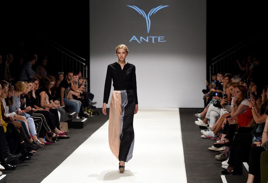 A model presents a creation of ANTE during Vienna Fashion Week 2019 in Vienna, Austria. (Xinhua/Guo Chen)