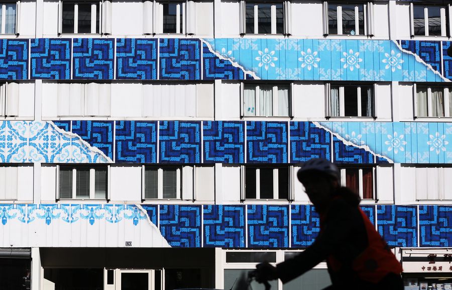 A resident passes by a building with mural paintings at the 13th district in Paris, France. (Xinhua/Gao Jing)